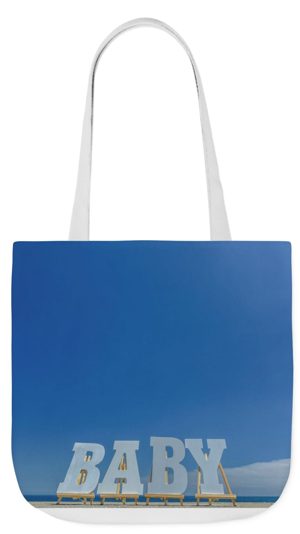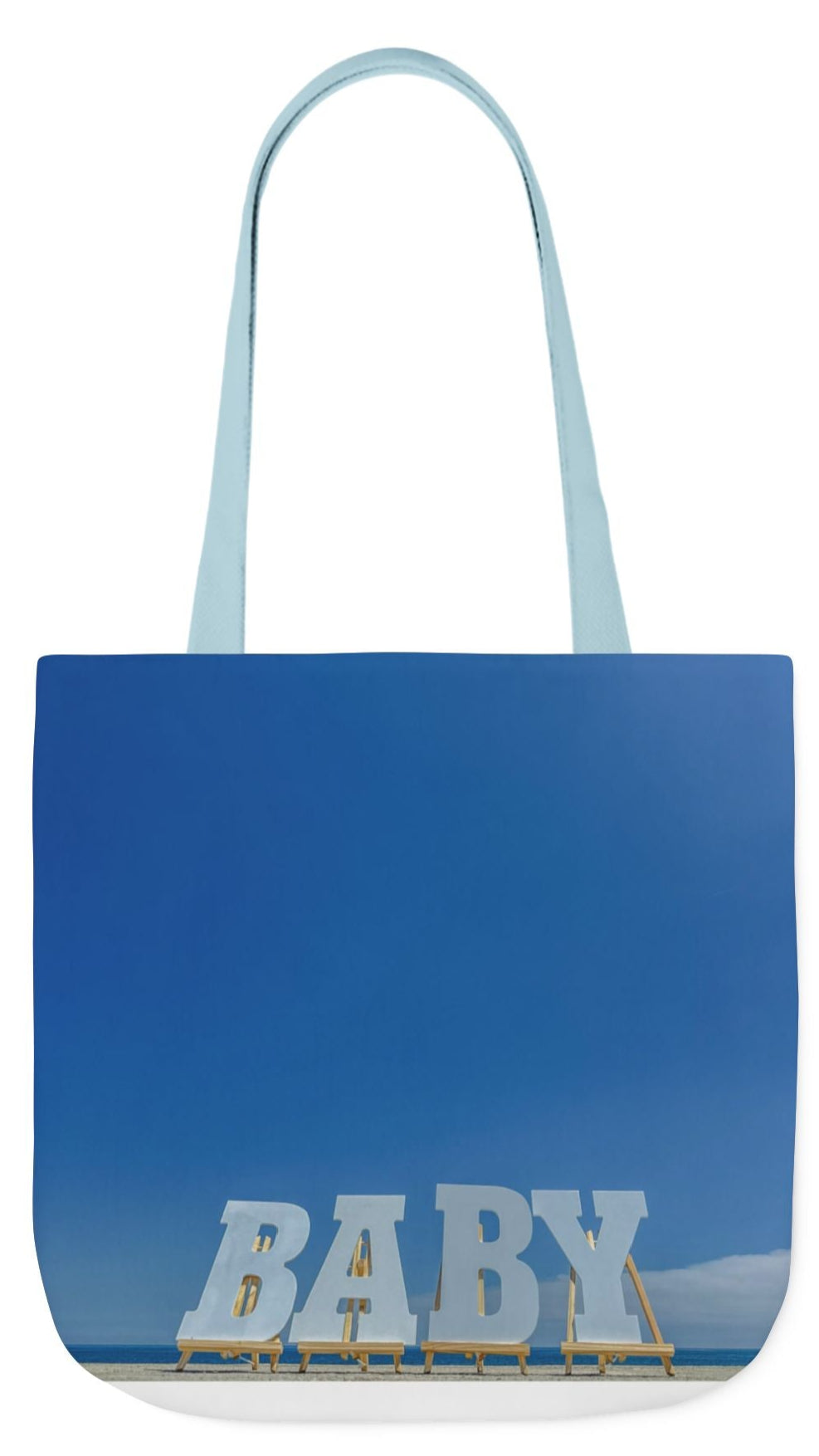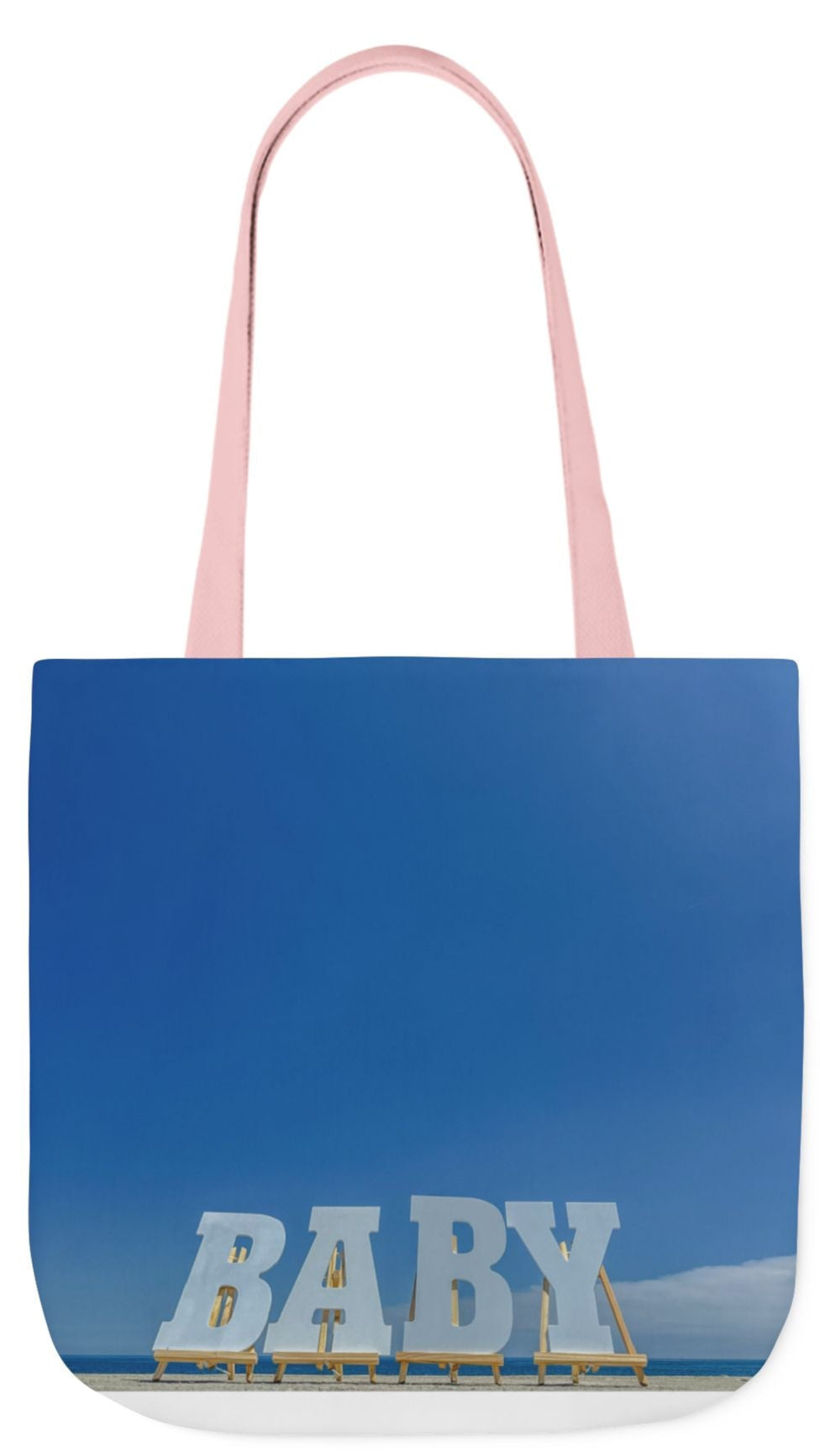 Baby Tote Bag 18”x 18” same all over print on each side with white, blue or pink handle options. “Baby Bag Bright Sky”.