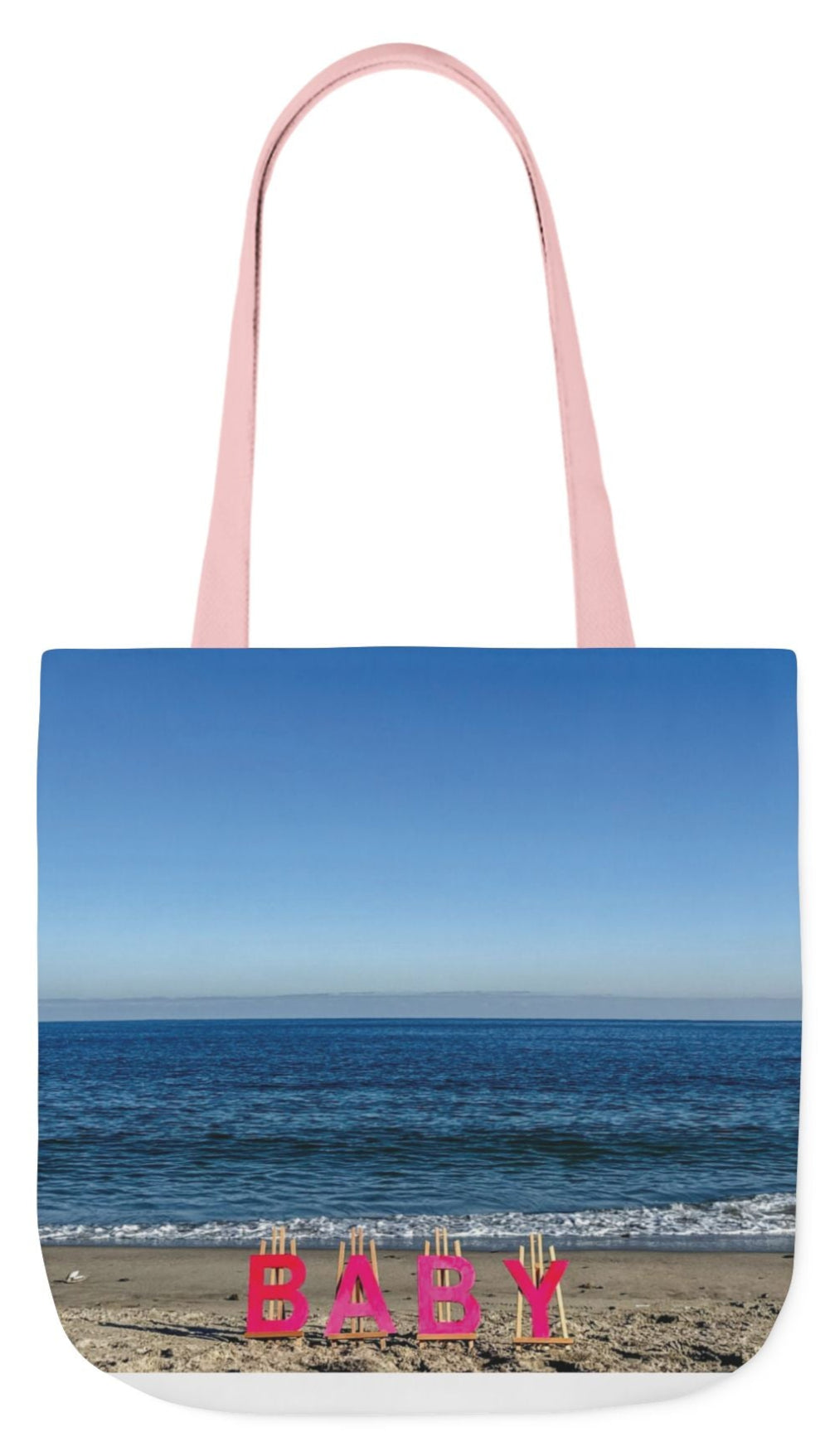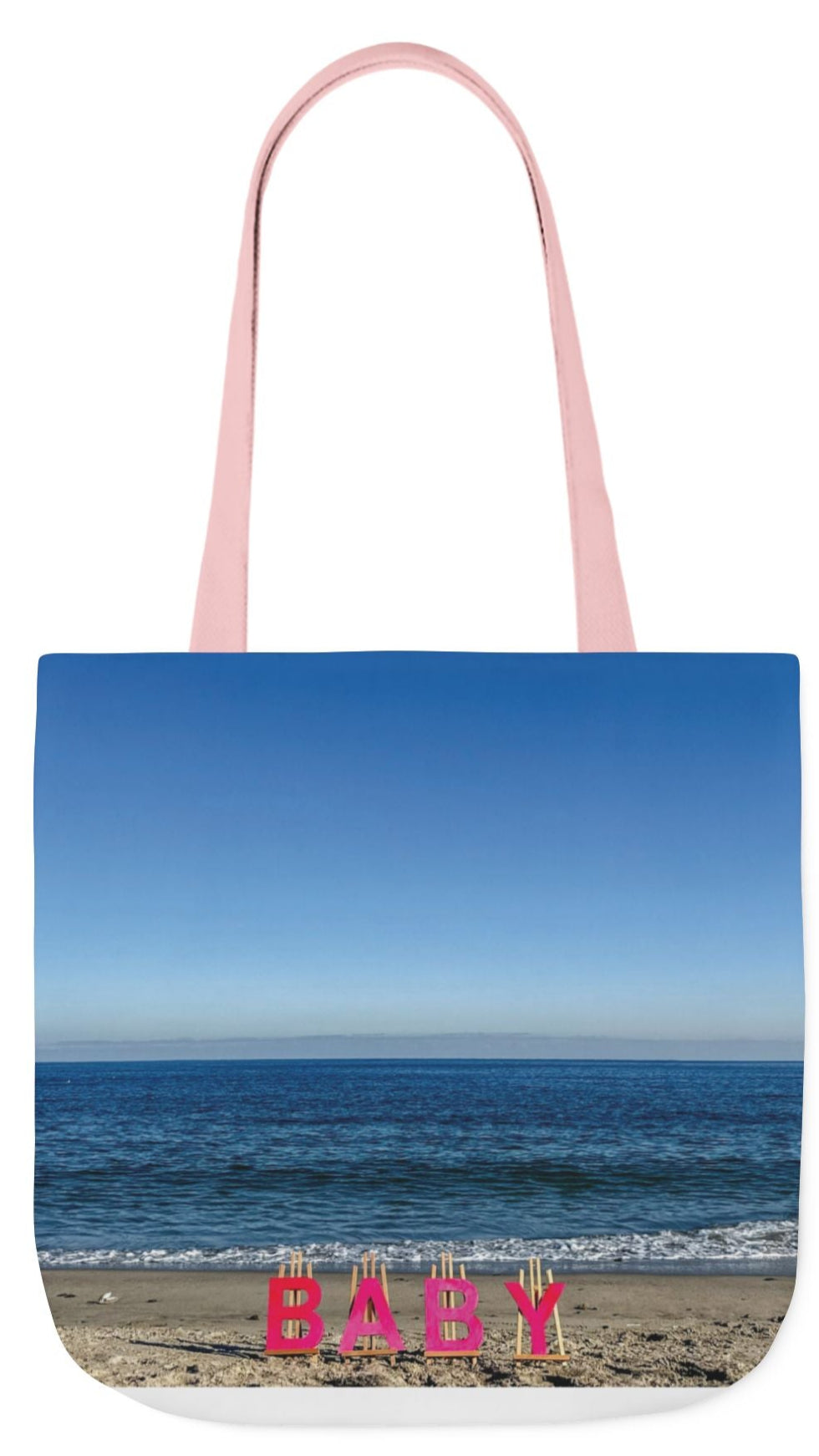 Baby Tote Bag (Pink) 18”x 18” same all over print on each side with pink or white handle options. “Beach Baby Tote Bag”.