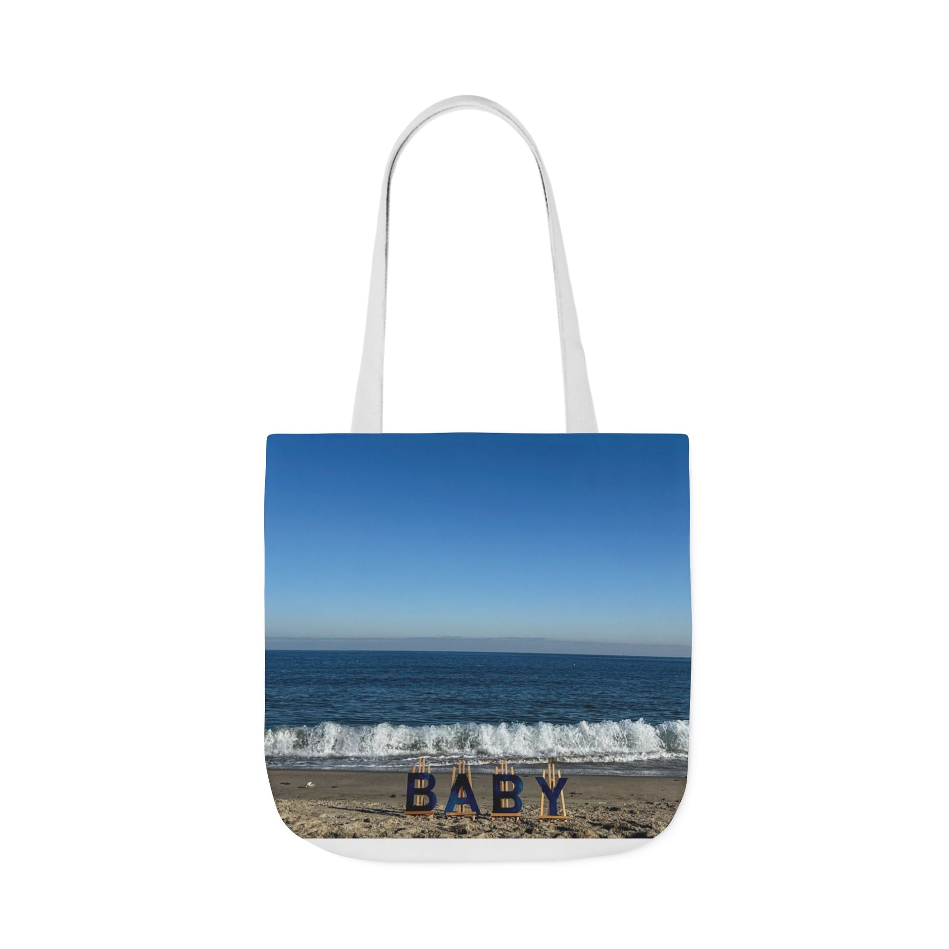 Baby Tote Bag with a choice of white or blue handles, 18" x 18" machine washable, roomy, durable, made of polyester, different print on each side. Great Baby Shower Gift.