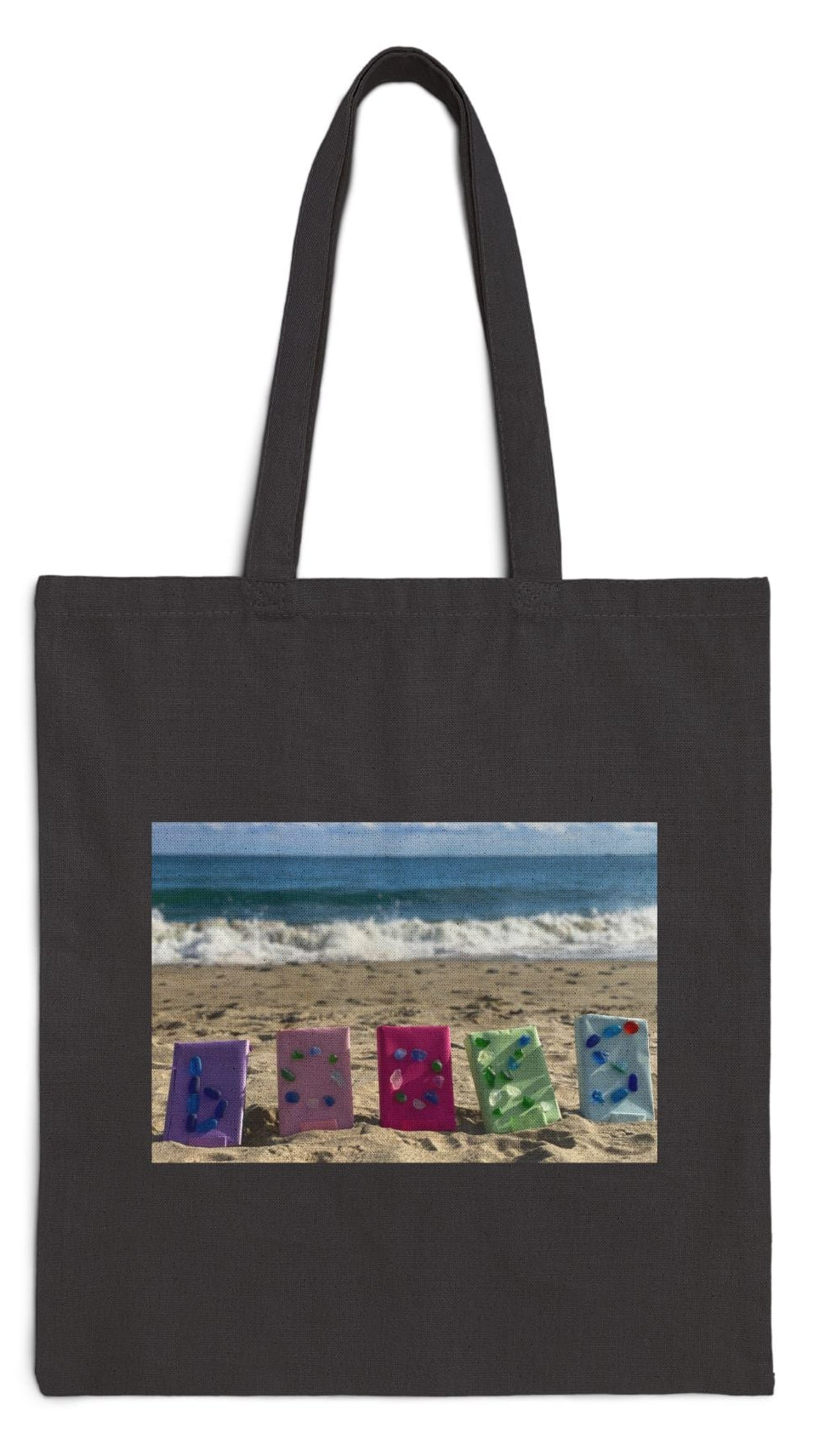 Book Tote Bag Black 15" x 16" Cotton Canvas Print on One Side. "Books on the Sand"