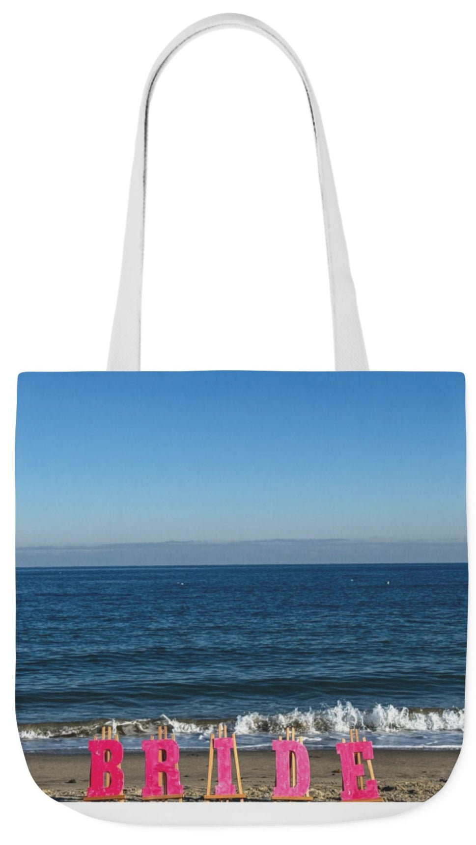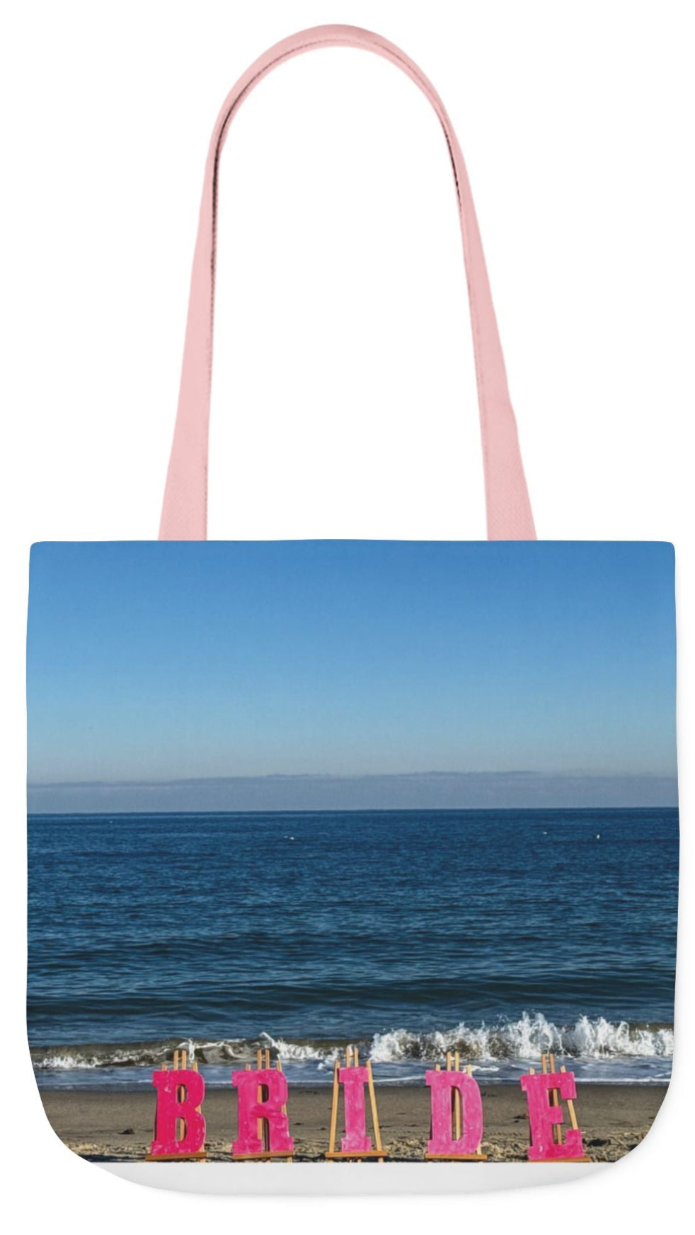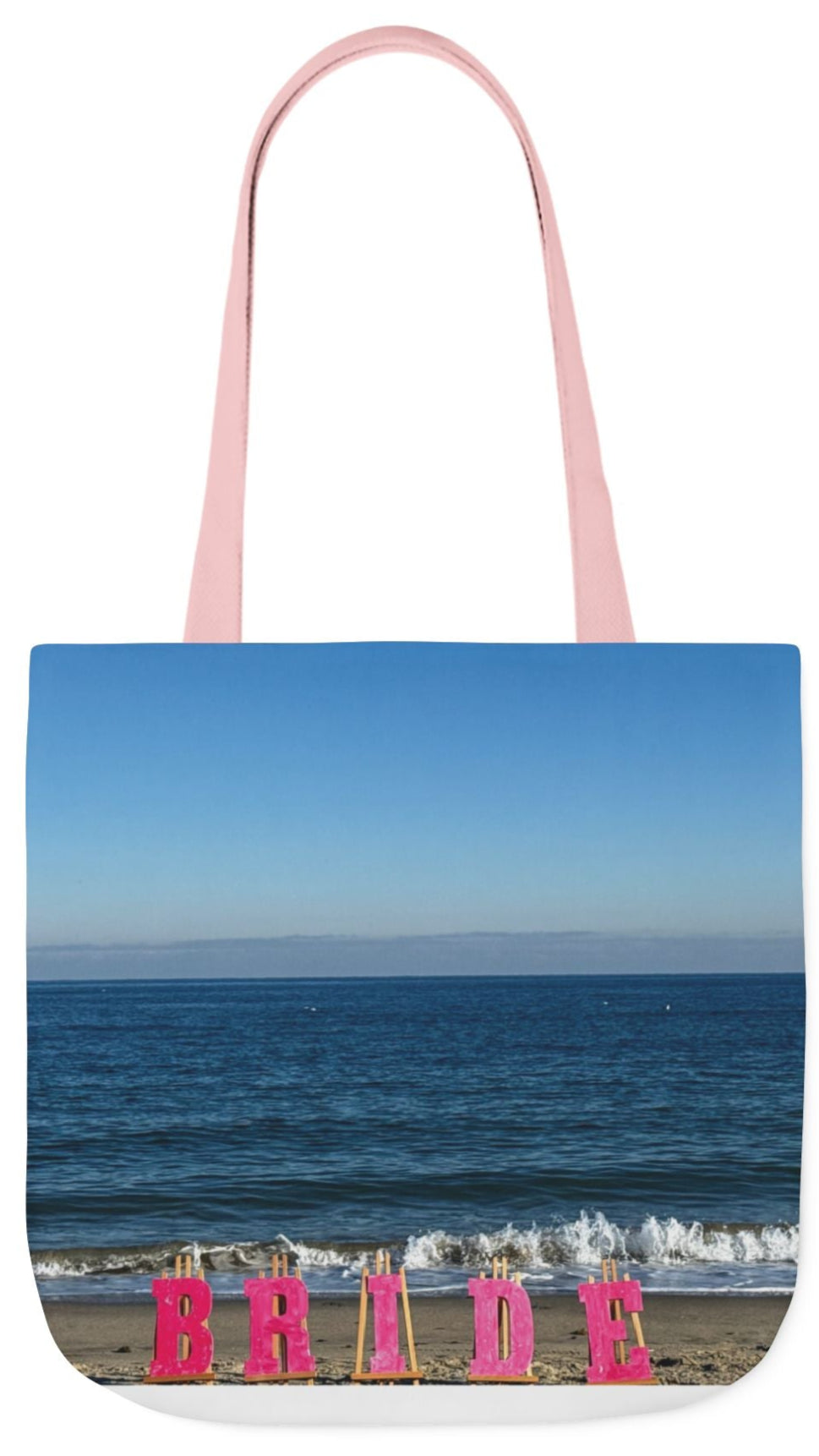 Bride Tote Bag 18" x 18" with allover same print on each side. Pink or white handle choice. "Beach Bride Bag"