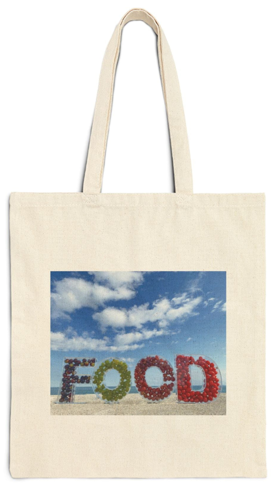This cotton canvas Natural Color Food Tote Bag comes in one size, has print on one side and is perfect for carrying groceries, breakfast, lunch and dinner.