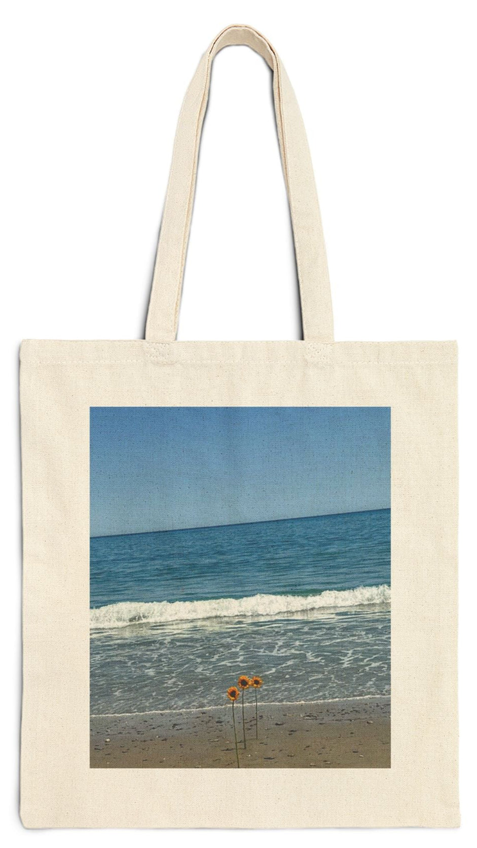 Floral Tote Bag Natural Color 15" x 16" Cotton Canvas Print on One Side. "Beachfront Flowers "