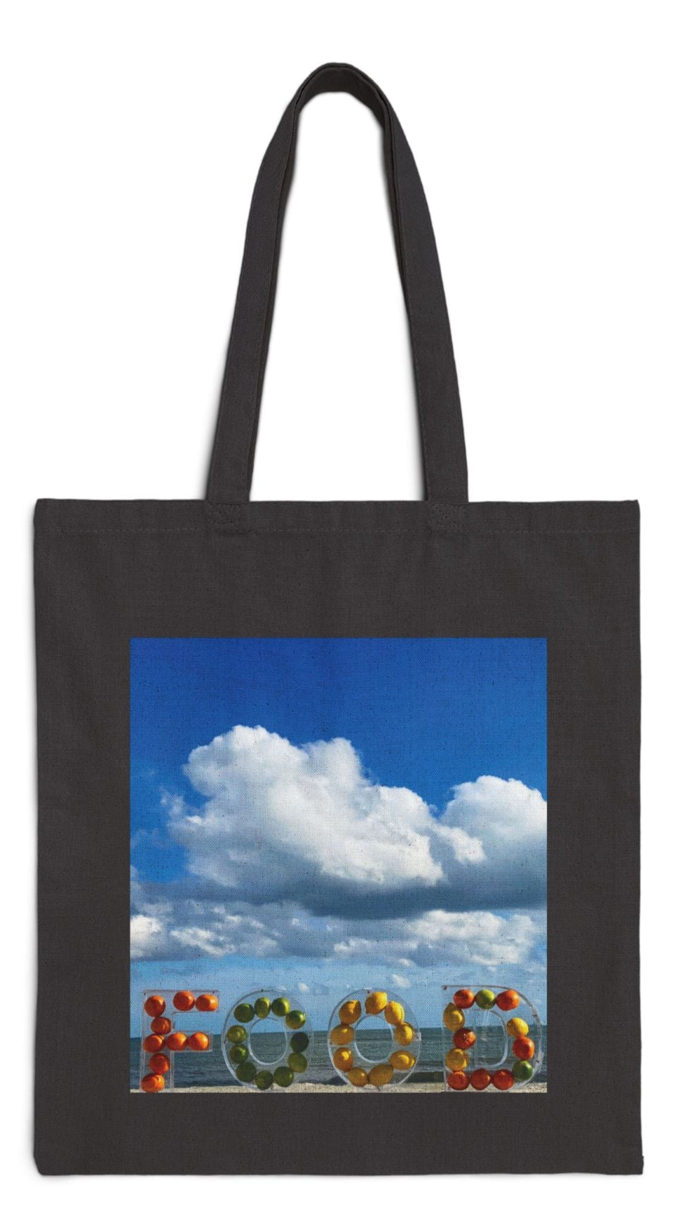 Food Tote Bag Black 15” x 16” Cotton Canvas Print on One Side. "Beachy Food" Bag.