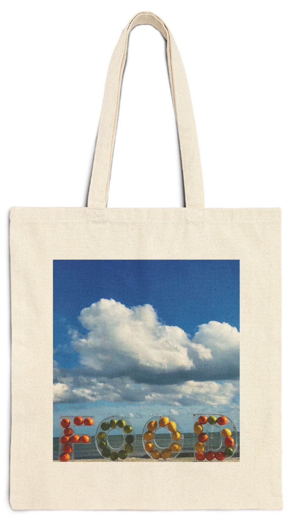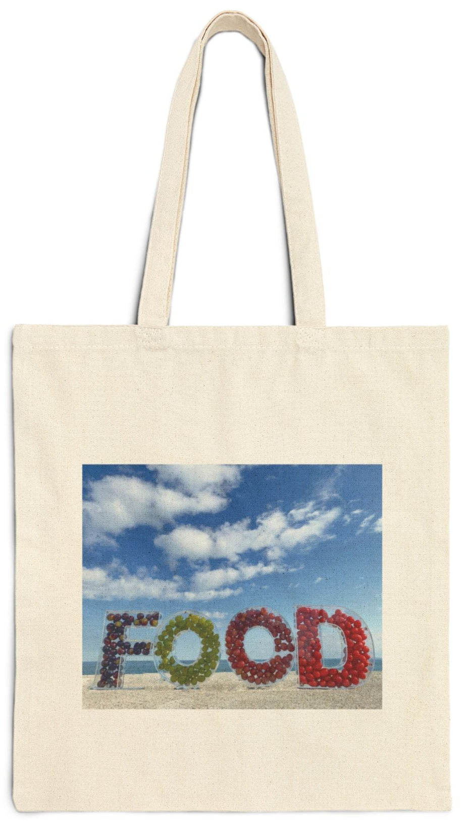 This cotton canvas Natural Color Food Tote Bag comes in one size, has different print on each side and is perfect for carrying groceries, breakfast, lunch and dinner.
