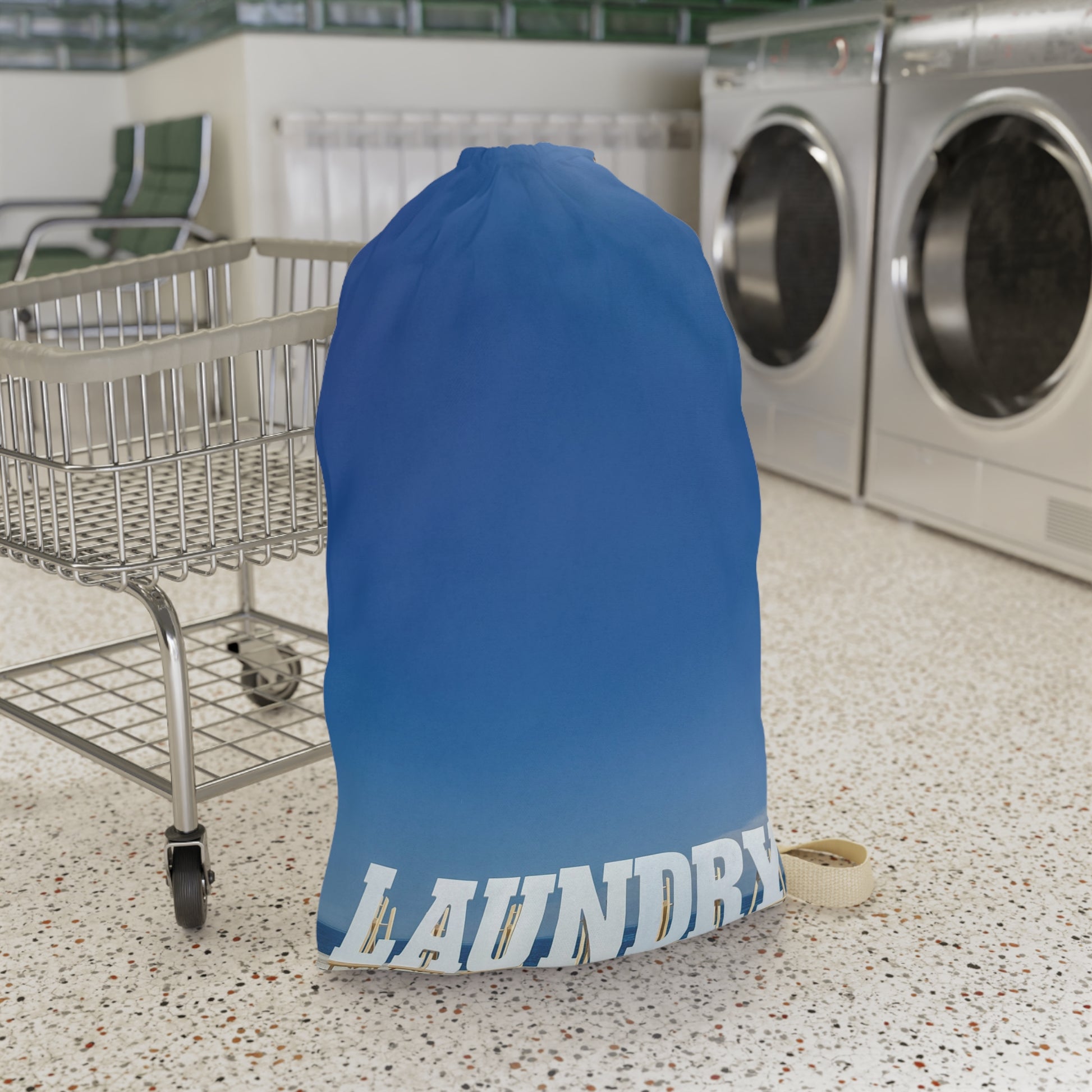 Laundry bag with shoulder strap and drawstring. Allover same print on both sides. "28 x "36. "Shoreline Laundry Day".