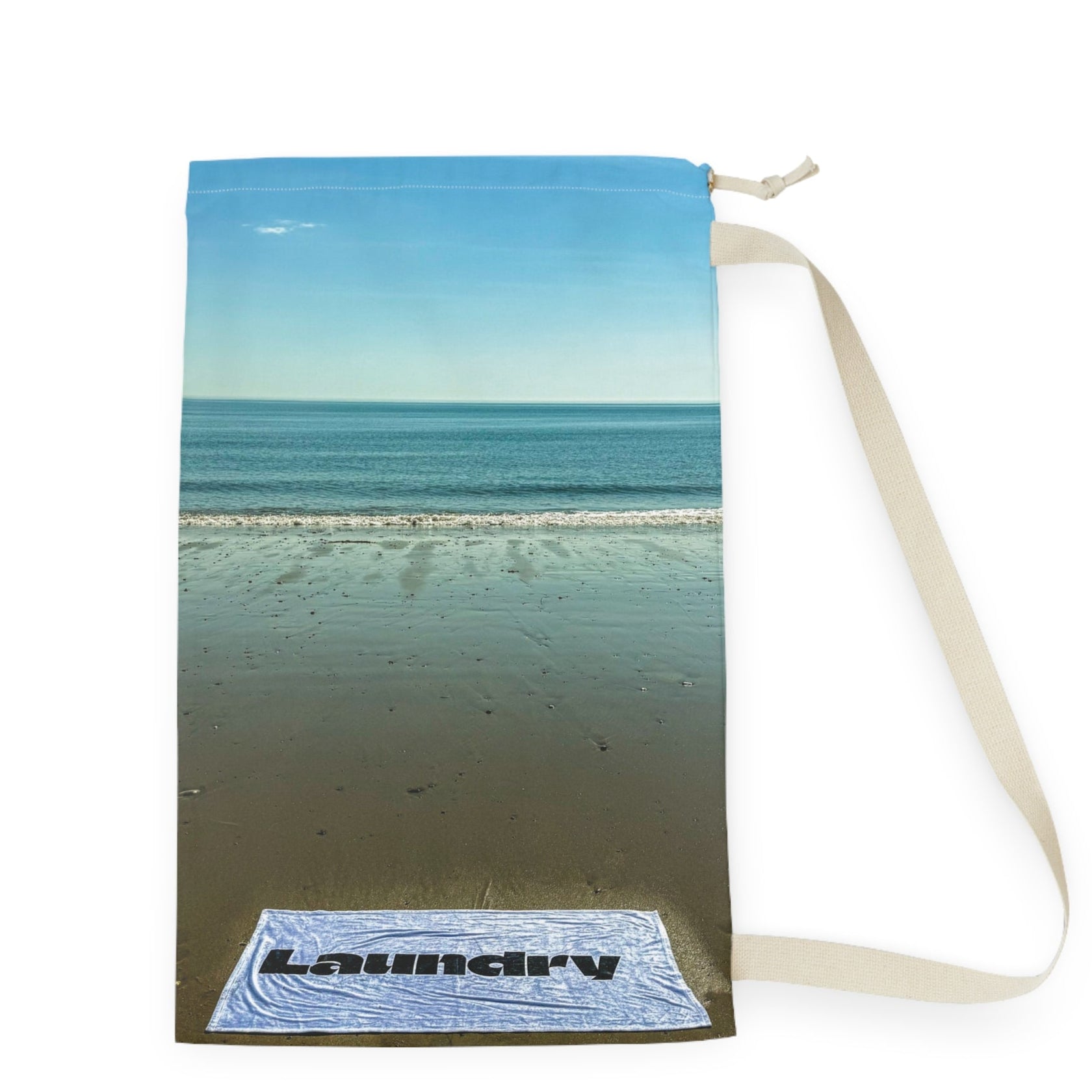 Laundry Bag with Shoulder Strap and Drawstring. Same print on both sides. "18 x 29". "Laundry day at the shore".