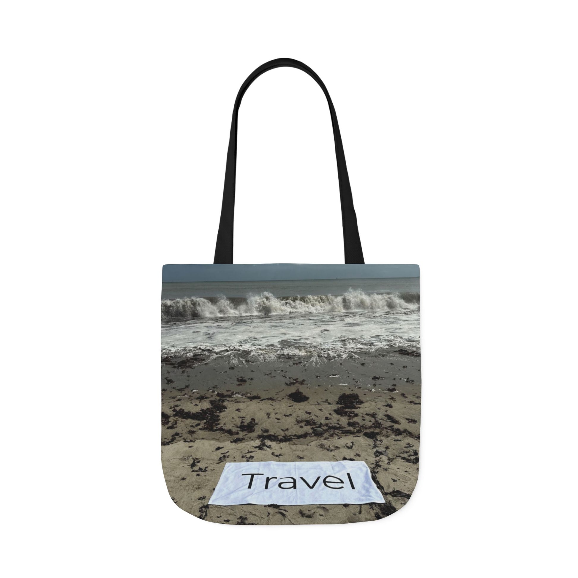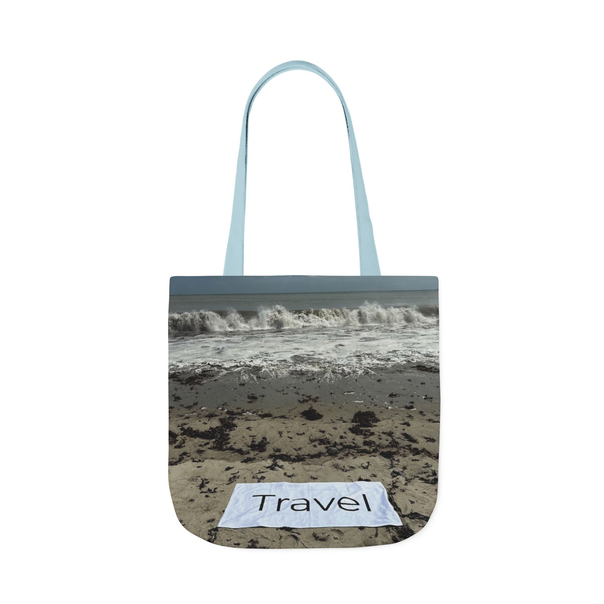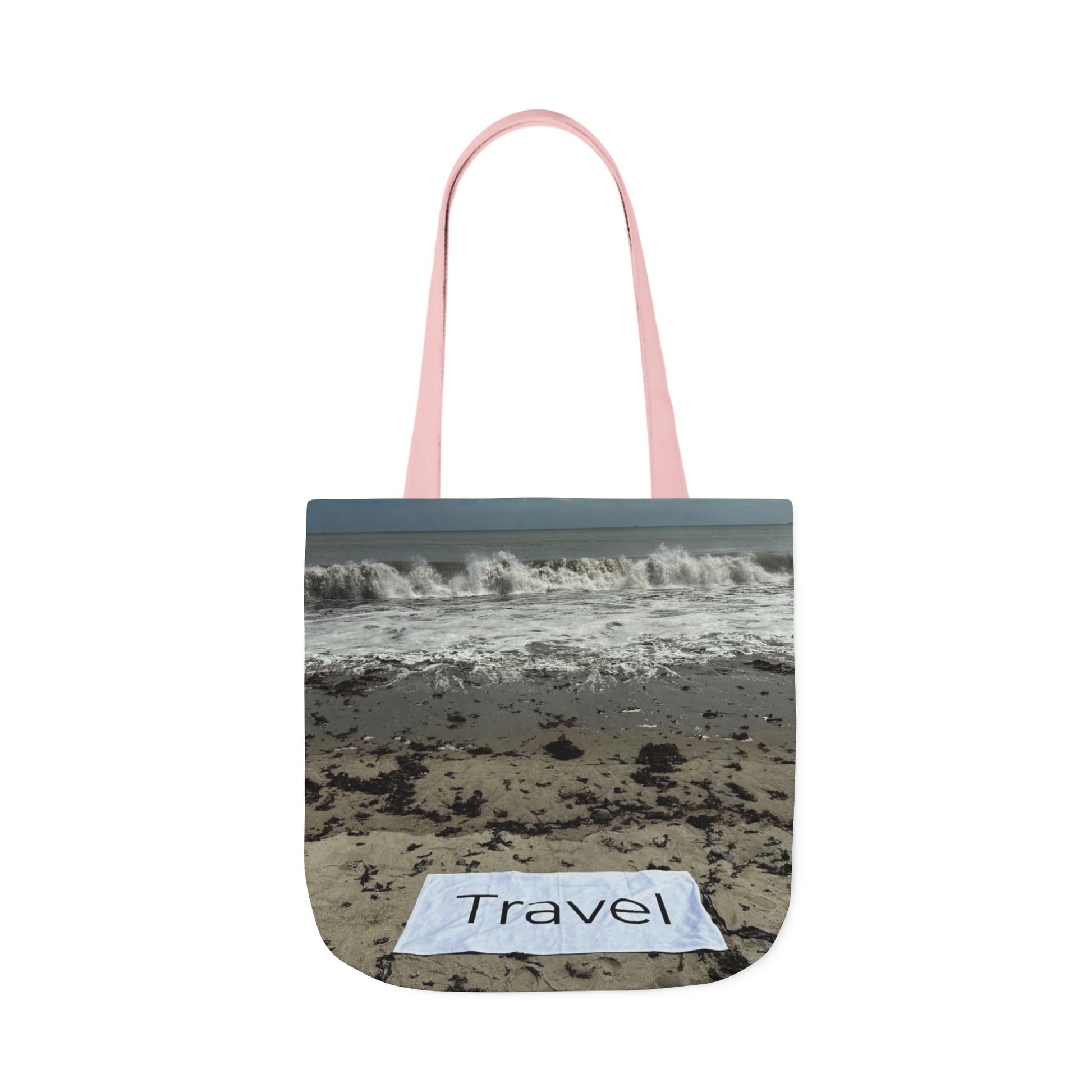 Roomy, machine washable 18" x 18" Travel Tote Bag made of polyester with same print on each side. 4 handle color options (White, Blue, Black, Pink).