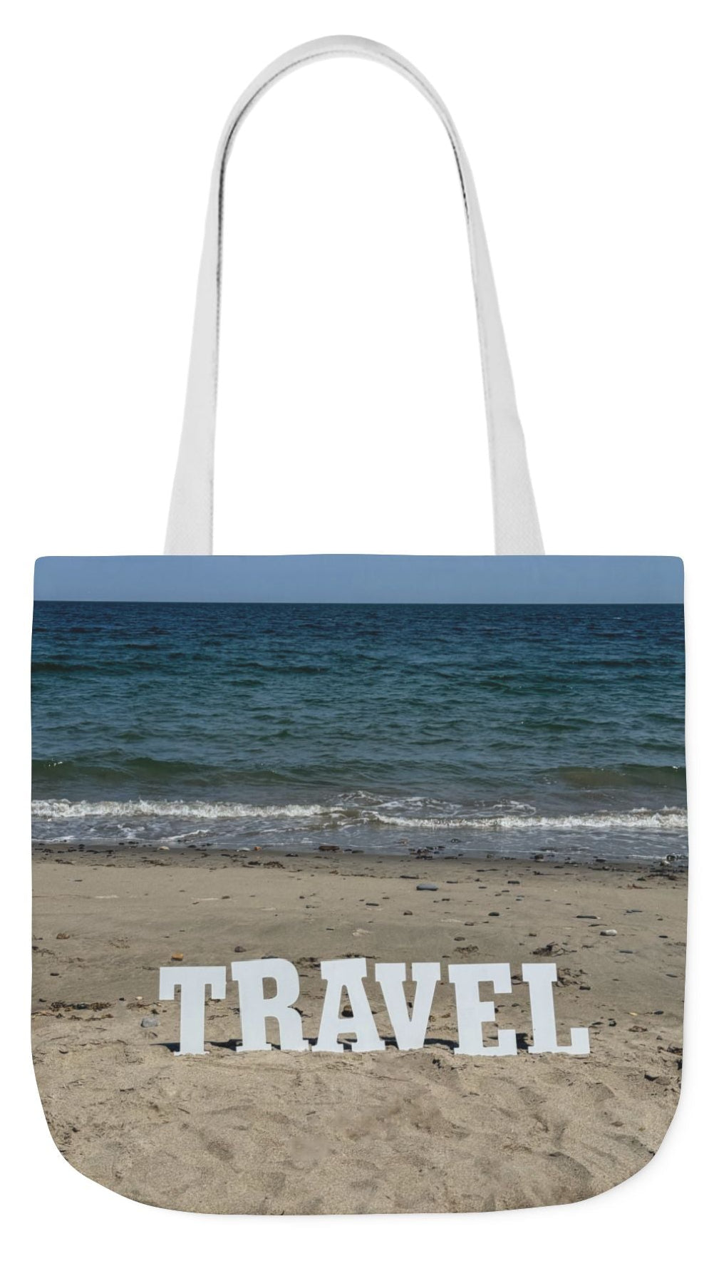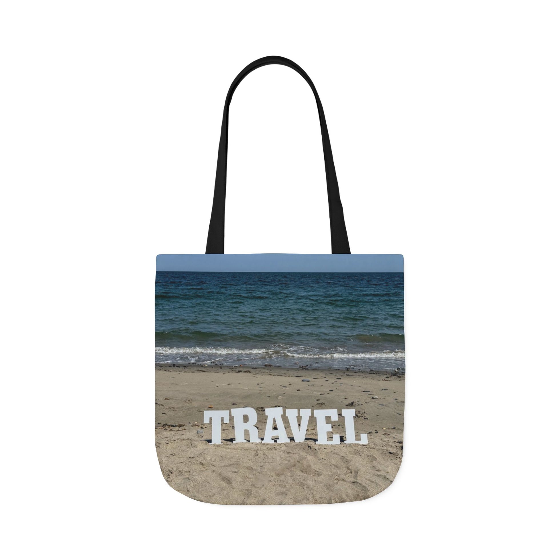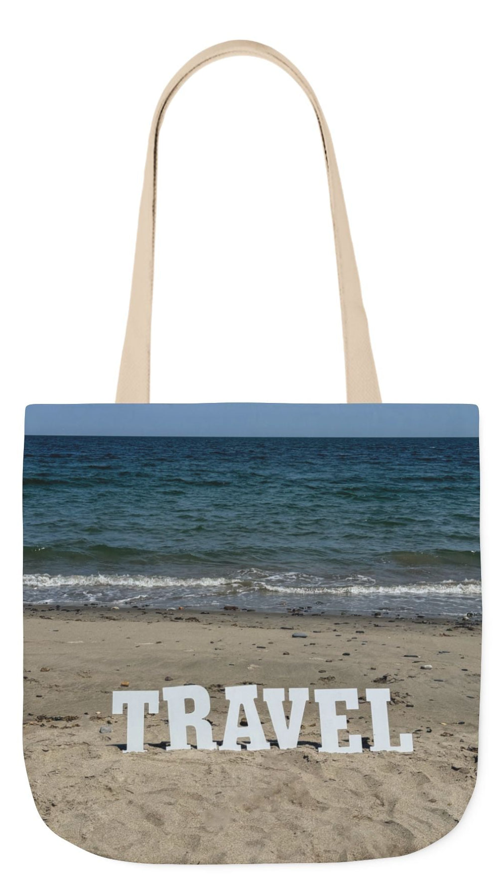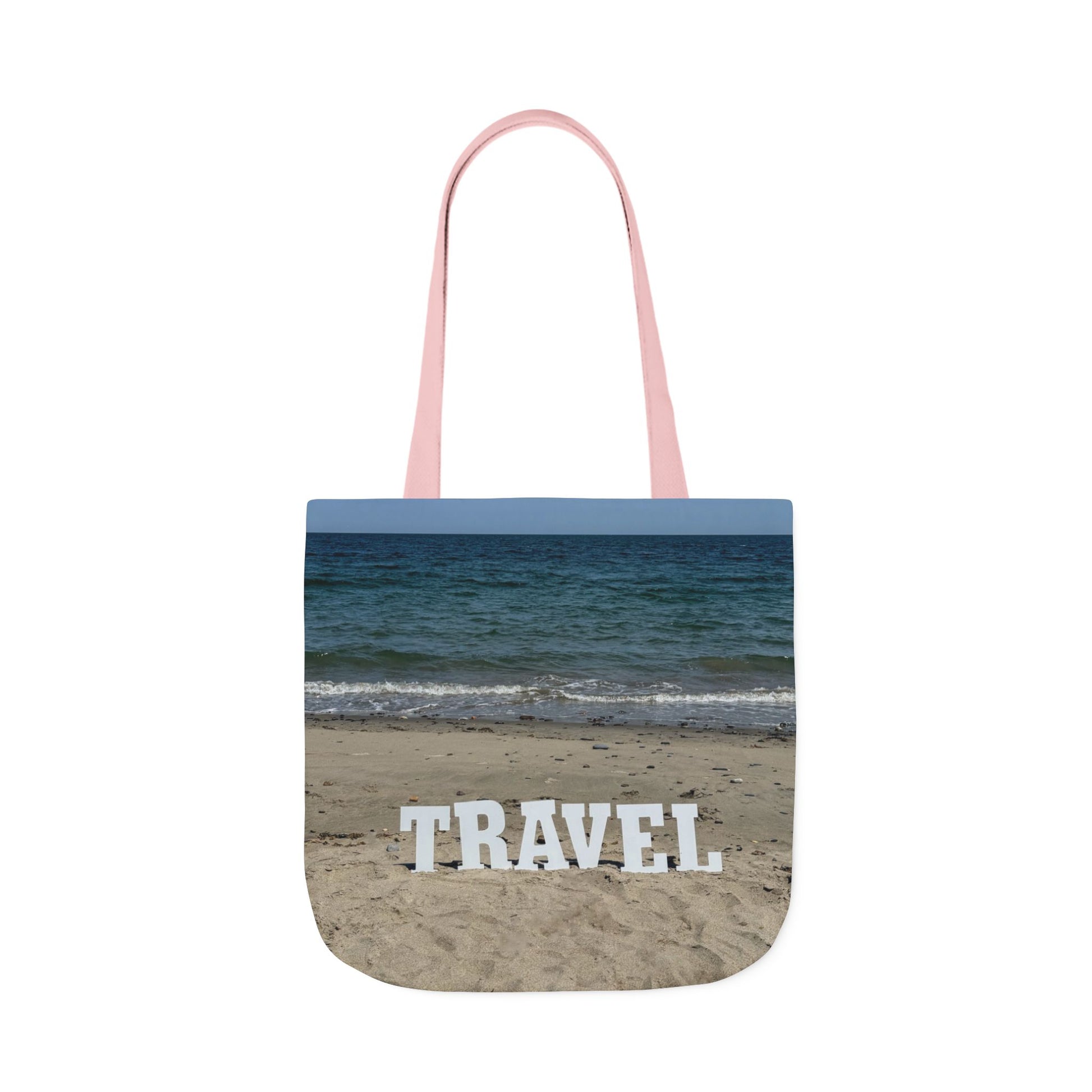 Travel Tote Bag 18" x 18" Polyester, black interior lining and an option of White, Blue, Beige, Black, Pink or White handles. It's lightweight, durable, roomy and great for a traveler.