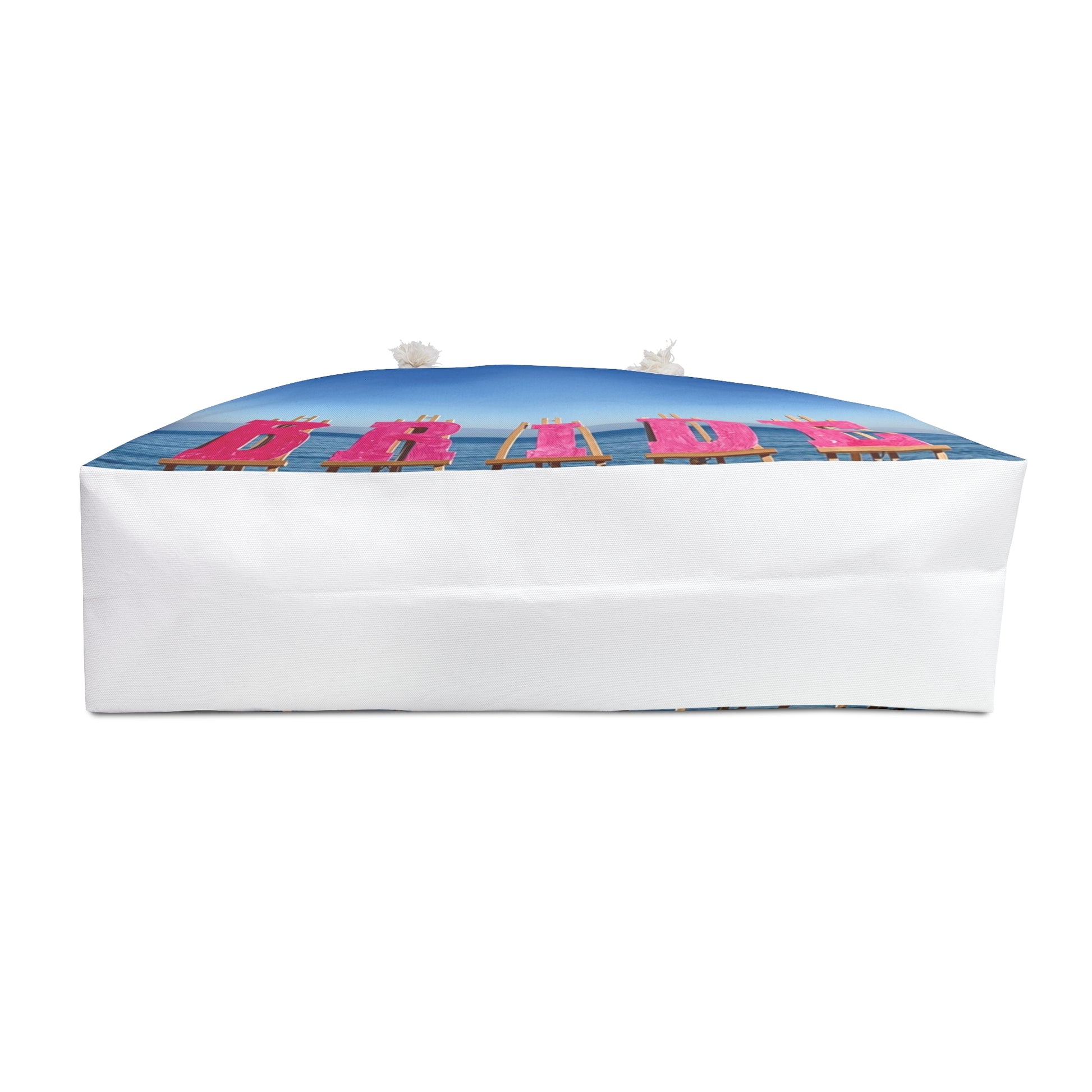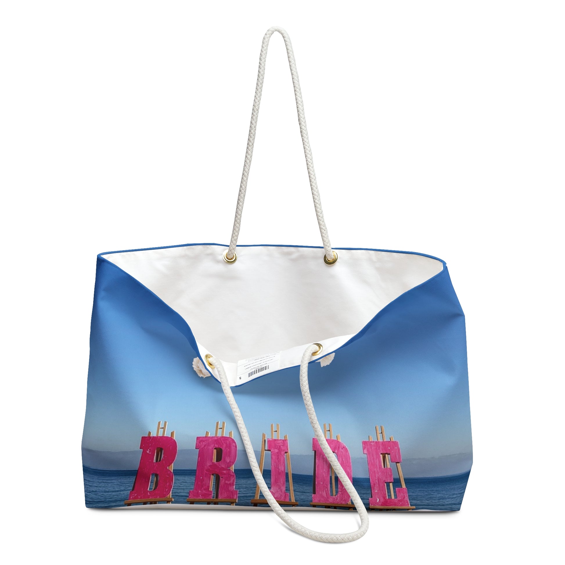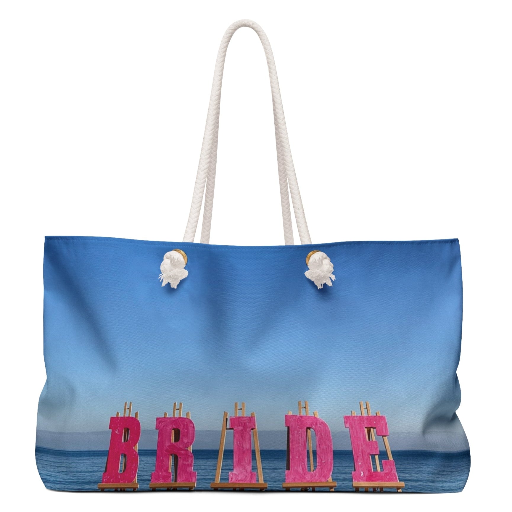 Bride Weekender Bag with same allover print on each side and rope handles. "24 x 13". "Seaside Bride Weekender Bag".